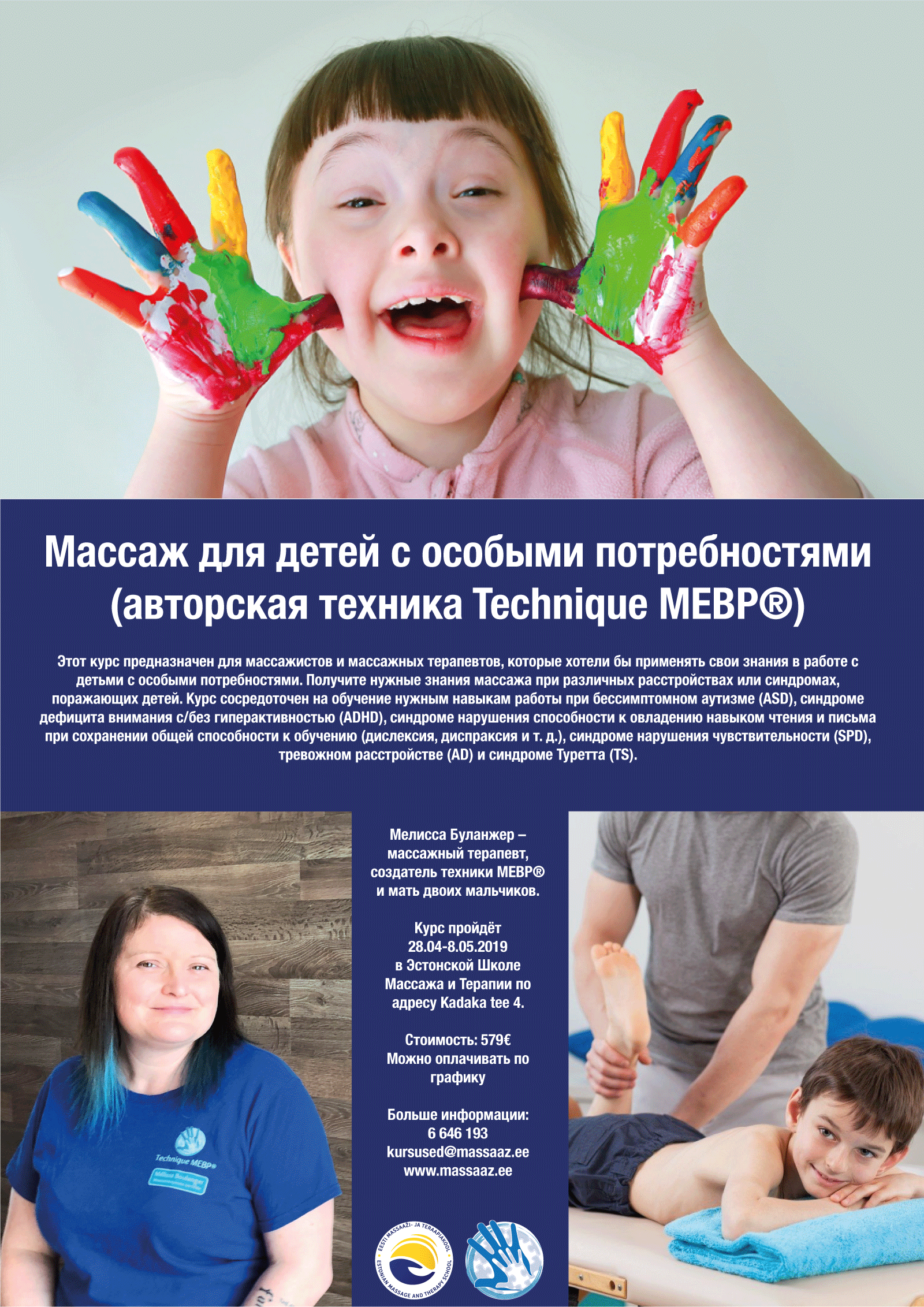 Приглашаем учавствовать на курсе: «Массаж для детей с особыми потребностями, авторская техника Technique MEBP®». Мелисса Буланжер (Канада) – массажный терапевт, создатель техники MEBP® и мать двоих мальчиков. Курс предназначен для массажистов и массажных терапевтов, которые хотели бы применять свои знания в работе с детьми с особыми потребностями. Получите нужные знания массажа при различных расстройствах или синдромах, поражающих детей. Курс сосредоточен на обучение нужным навыкам работы при бессимптомном аутизме (ASD), синдроме дефицита внимания с/без гиперактивностью (ADHD), синдроме нарушения способности к овладению навыком чтения и письма при сохранении общей способности к обучению (дислексия, диспраксия и т. д.), синдроме нарушения чувствительности (SPD), тревожном расстройстве (AD) и синдроме Туретта (TS). Посмотрите видео о курсе тут: https://m.youtube.com/watch?v=wRbdlyRbxRw Курс пройдёт 28.04-8.05.2019 в Эстонской Школе Массажа и Терапии по адресу Kadaka tee 4. Курс предназначен для массажистов и массажных терапевтов, которые хотели бы применять свои знания в работе с детьми с особыми потребностями. Массажист и массажный терапевт смогут улучшить свои знания о различных расстройствах или синдромах, поражающих детей. Во время курса также будут рассмотрены конкретные навыки и знания, необходимые для правильной работы с особыми детьми. Учащегося научат распознавать конкретные потребности ребенка и соответствующим образом применять свои знания в практике. В конце курса массажист или массажный терапевт сможет выполнить серию массажей, рассматривая различные эмоциональные, физические и духовный особенности ребенка. Содержание курса : • Знаки и симптомы основных расстройств и синдромов, поражающих детей. • Ноу-хау: адаптировать методы и окружающую среду. • Мягкие техники : адекватно взаимодействовать и общаться. Управлять непредвиденными ситуациями и кризисами или истериками. Цель 1: Базовое понимание расстройств и синдромов, которые чащу всего выявляются у детей.Конкретные цели: 1. Понять различия между расстройством и болезнью. 2. Понять различные признаки и симптомы бессимптомного аутизма (ASD), синдрома дефицита внимания с/без гиперактивности (ADHD), синдрома нарушения способности к овладению навыком чтения и письма при сохранении общей способности к обучению(дислексия, диспраксия и т. Д.), Синдрома нарушения чувствительности (SPD), тревожного расстройства (AD) и синдрома Туретта (TS). Цель 2: Применение методов и подготовка среды для принятия детей с особыми потребностями. Конкретные цели: 1. Представление основных процедур, которые будут использованны в повседневных сеансах, и последовательность маневров. 2. Ввести в сеанс приёмы из Шведского массажа, а так же приёмы Шиацу. 3. Признать преимущества массажа в проприоцептивной системе. 4. Приспособить среду, используя различные инструменты. 5. Принимать во внимание возможные противопоказания. Цель 3: Адекватное взаимодействие и общение с ребенком и его родителями. Конкретные цели: 1. Найти подход и взаимодействие с ребенком. 2. Понять основные характеристики общения. 3. Понять разные реакции и как ими управлять. 4. Научиться использовать свои специфические интересы во время массажа. 5. Понять, как общаться с родителями. Мелисса Буланжер – массажный терапевт, создатель техники MEBP® (массаж для детей с особыми потребност