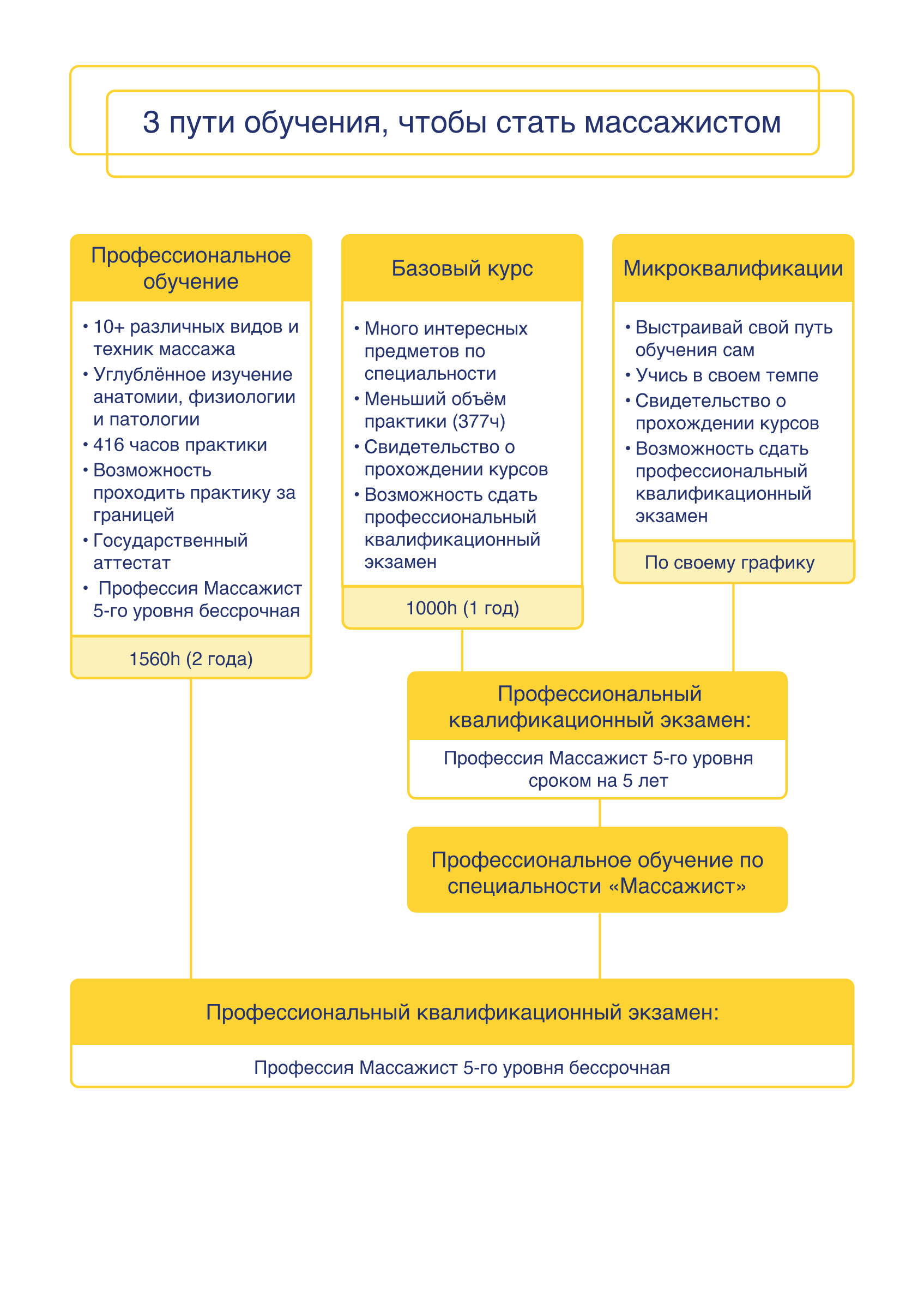 | Свидетельство | Государственный аттестат об окончании профессионального образования массажиста с бессрочной профессией | Свидетельство о прохождении повышения квалификации, возможность сдачи профессионального экзамена |